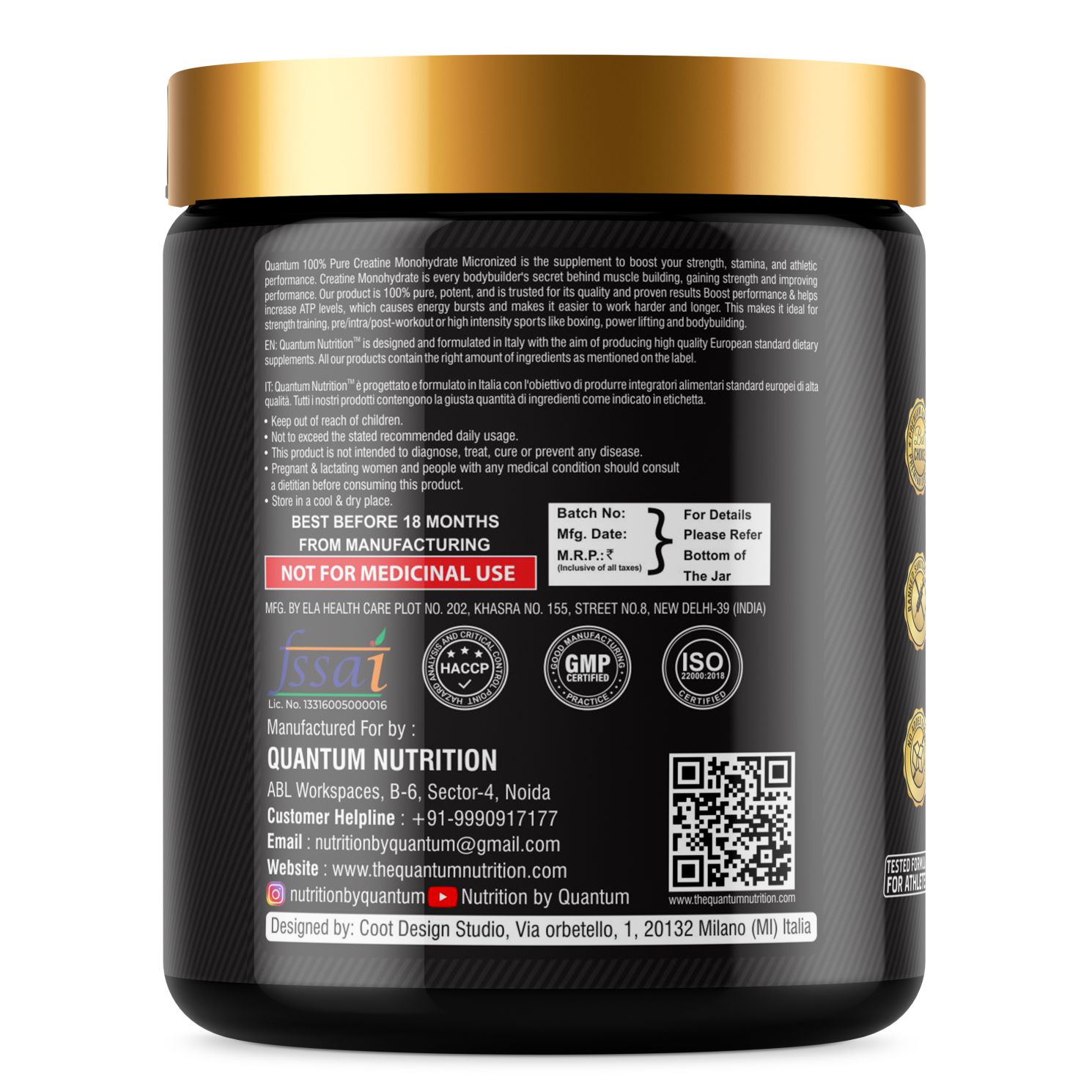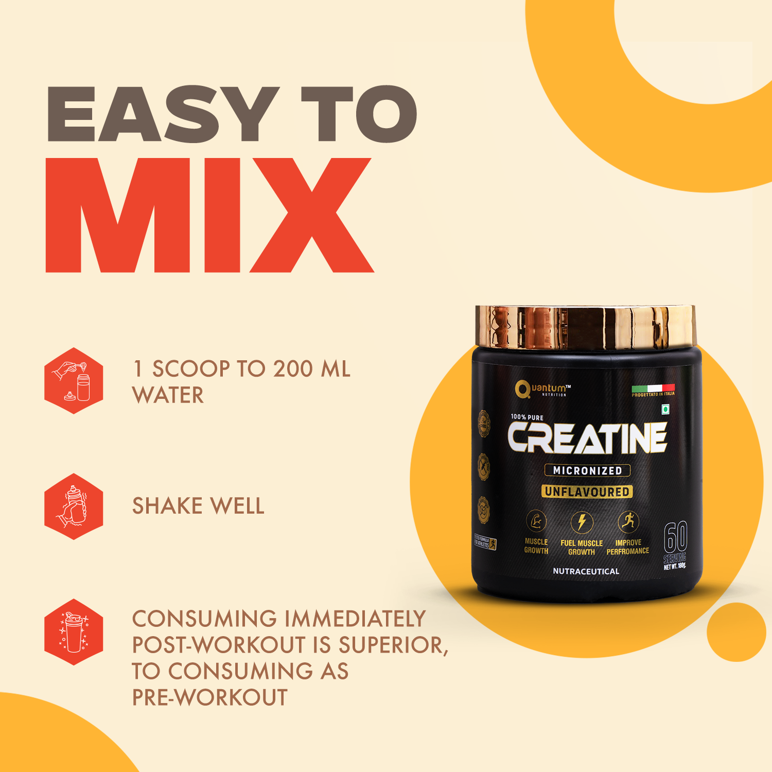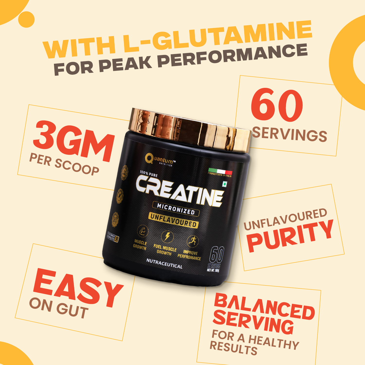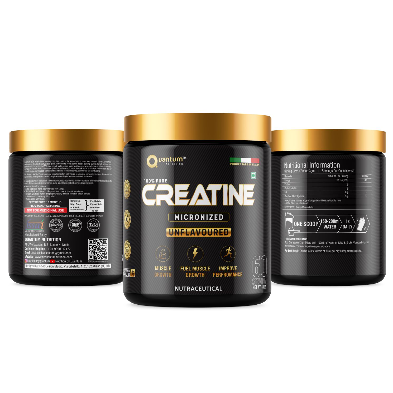 Quantum Nutrition Creatine Micronized is formulated using high-quality European-grade creatine monohydrate. Its ultra-fine micronized particles mix instantly and absorb faster, helping increase ATP levels for better strength, power output, and endurance.